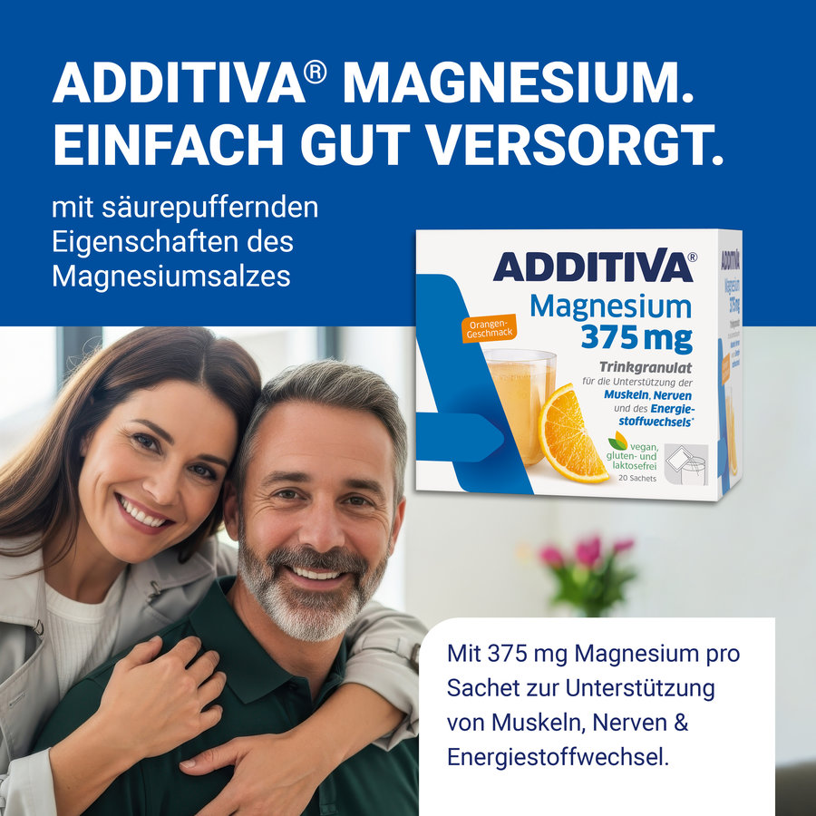 ADDITIVA Magnesium 375 mg Trinkgranulat Orange liefert Dir eine praktische Lösung: 375 mg Magnesium pro Portion – hochdosiert, gut verträglich und angenehm fruchtig im Geschmack.