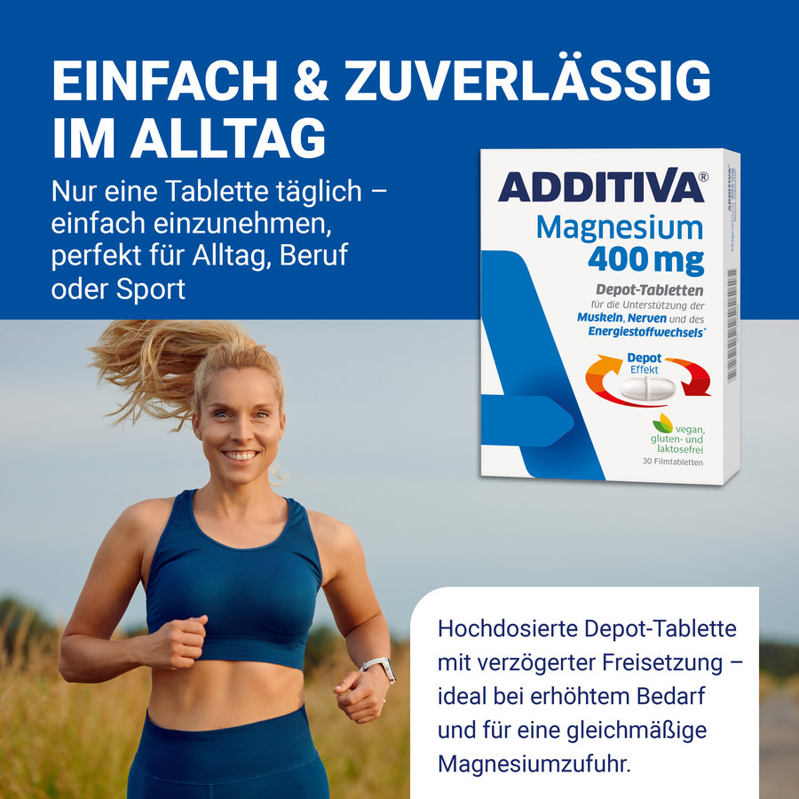 Mit ADDITIVA entscheidest Du Dich für ein Produkt, das höchste Qualitätsansprüche erfüllt – entwickelt für Menschen mit einem aktiven Lebensstil. Die Filmtablette ist kompakt, leicht einzunehmen und durch die retardierte Freisetzung besonders verträglich, auch bei empfindlichem Magen.