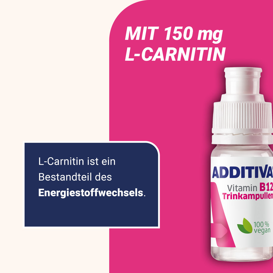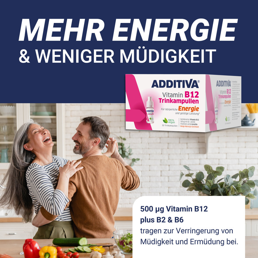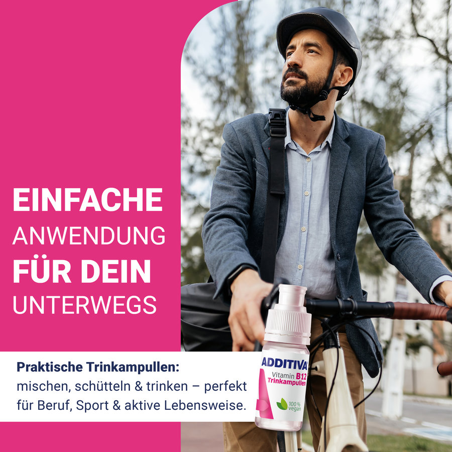 Dank 500 µg Vitamin B12 pro Trinkampulle stellen die hochdosierten ADDITIVA Vitamin B12 Trinkampullen sicher, dass Dein Körper auch bei eingeschränkter Aufnahme optimal versorgt wird.